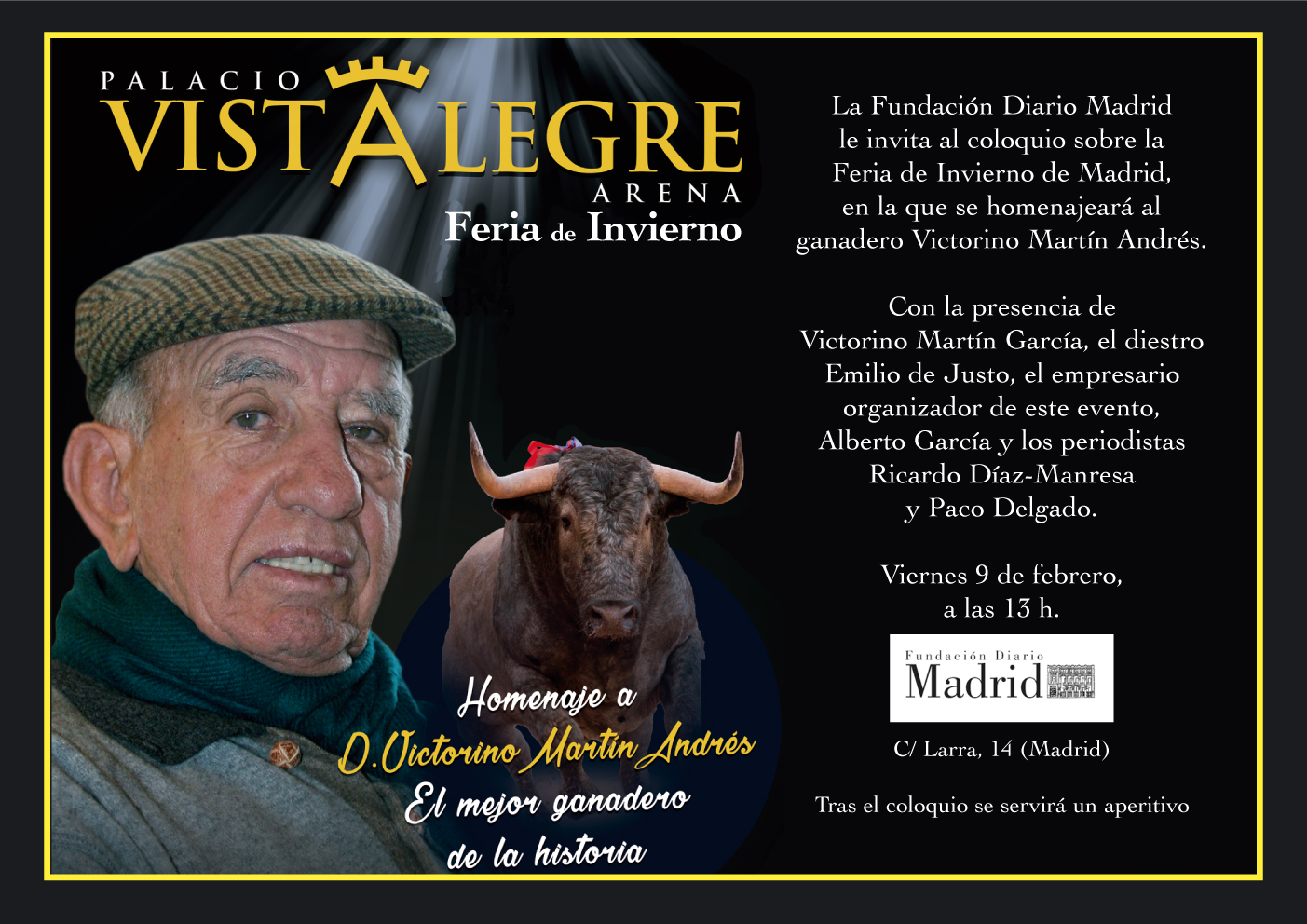 La Fundación Diario Madrid acogerá el próximo día 9 de febrero, a las 13 horas, un homenaje a Victorino Martín, eje sobre el que se sustenta la Feria de Invierno de Vistalegre y que, organizada por Alberto García, consta de dos festejos: