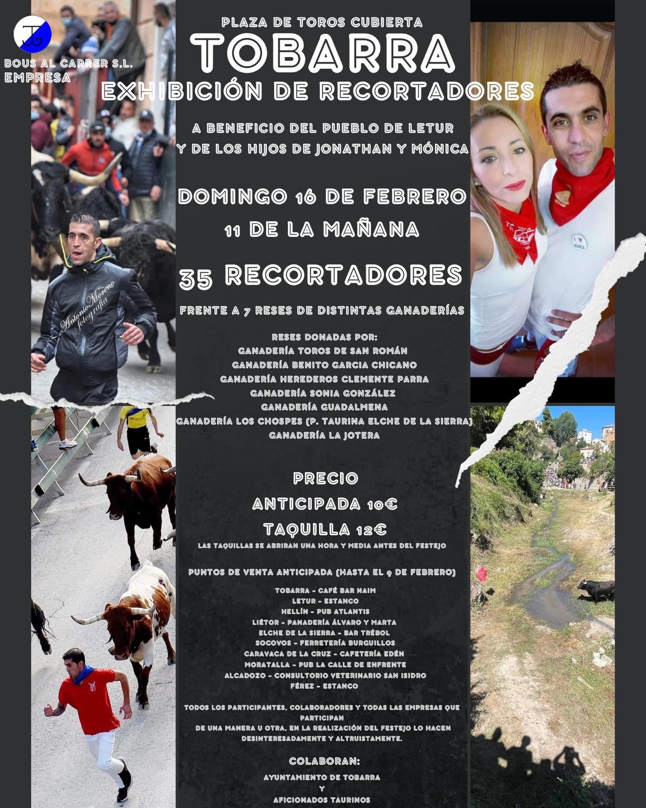 Gregorio de Jesús al frente de empresa Bous al Carrer S.L, junto con los amigos de Mónica y Jonathan, han presentado el cartel anunciador de la exhibición de recortes que se celebrará el domingo 16 de febrero a las once de la mañana en la plaza de toros manchega de Tobarra, a beneficio del pueblo de Letur y de los hijos de Jonathan y Mónica.