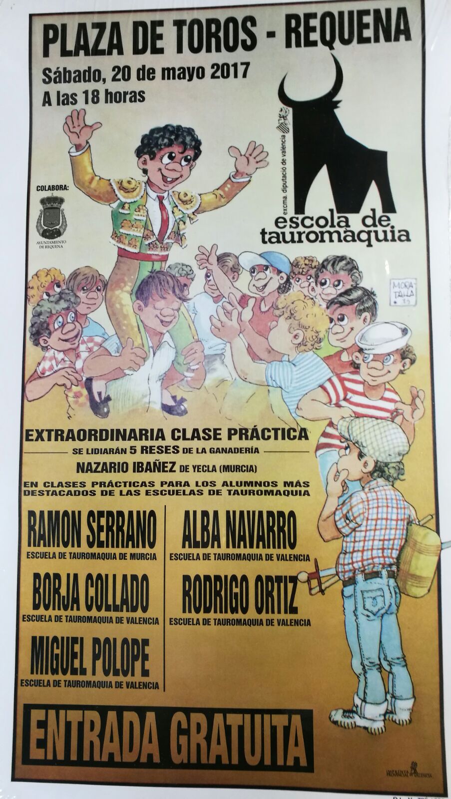 El próximo sábado, día 20 de mayo, la plaza de toros de Requena abrirá sus puertas para ser escenario de una clase práctica con participación de los alumnos de la Escuela de Tauromaquia de Valencia. En la mismo se lidiarán reses de Nazario Ibañez cuatro de los alumnos más destacados de la escuela de Valencia, como Borja Collado, Miguel Polope, Alba Navarro y Rodrigo Ortiz. Completará el quinteto Ramón Serrano, de la escuela taurina de Murcia. El festejo comenzará a las seis de la tarde y la entrada a la plaza será gratuita para todos cuantos quieran asistir a la novillada.