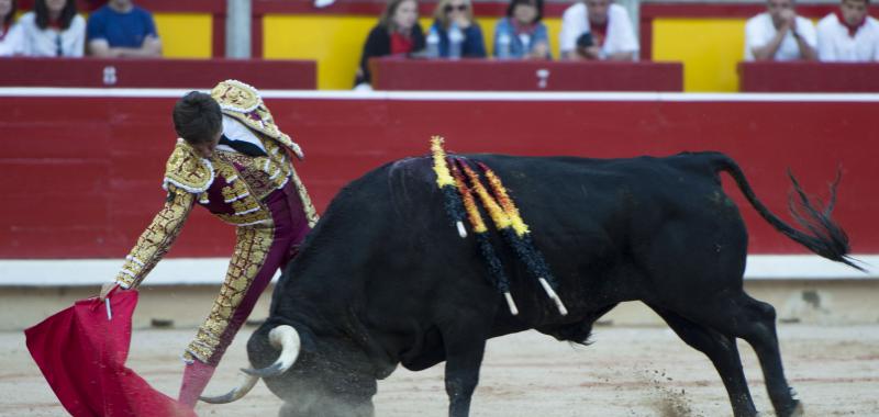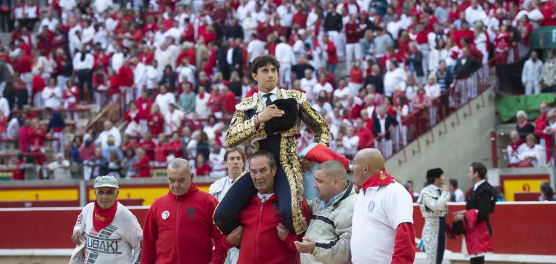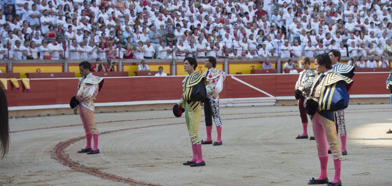 Pamplona. Lunes 11 de julio. Lleno total. Seis toros de Jandilla, muy bien presentados en tres y tres, más cuajados los de la segunda mitad. Dieron buen juego en líneas generales, destacando sobre los seis el lidiado en quinto lugar, de nombre “Decano”, que fue excepcional para el toreo. Diego Urdiales (ciclamen y oro): Bajonazo, silencio. Estocada, palmas con saludos. Alejandro Talavante (fuscia y oro): Estocada trasera y descabello, oreja. Pinchazo, media trasera caída y dos descabellos, vuelta clamorosa. Alberto López Simón (rosa y oro): Pinchazo en la suerte de recibir y estocada tardando mucho en doblar el toro, aviso y oreja. Pinchazo y estocada, petición insuficiente y vuelta al ruedo.
