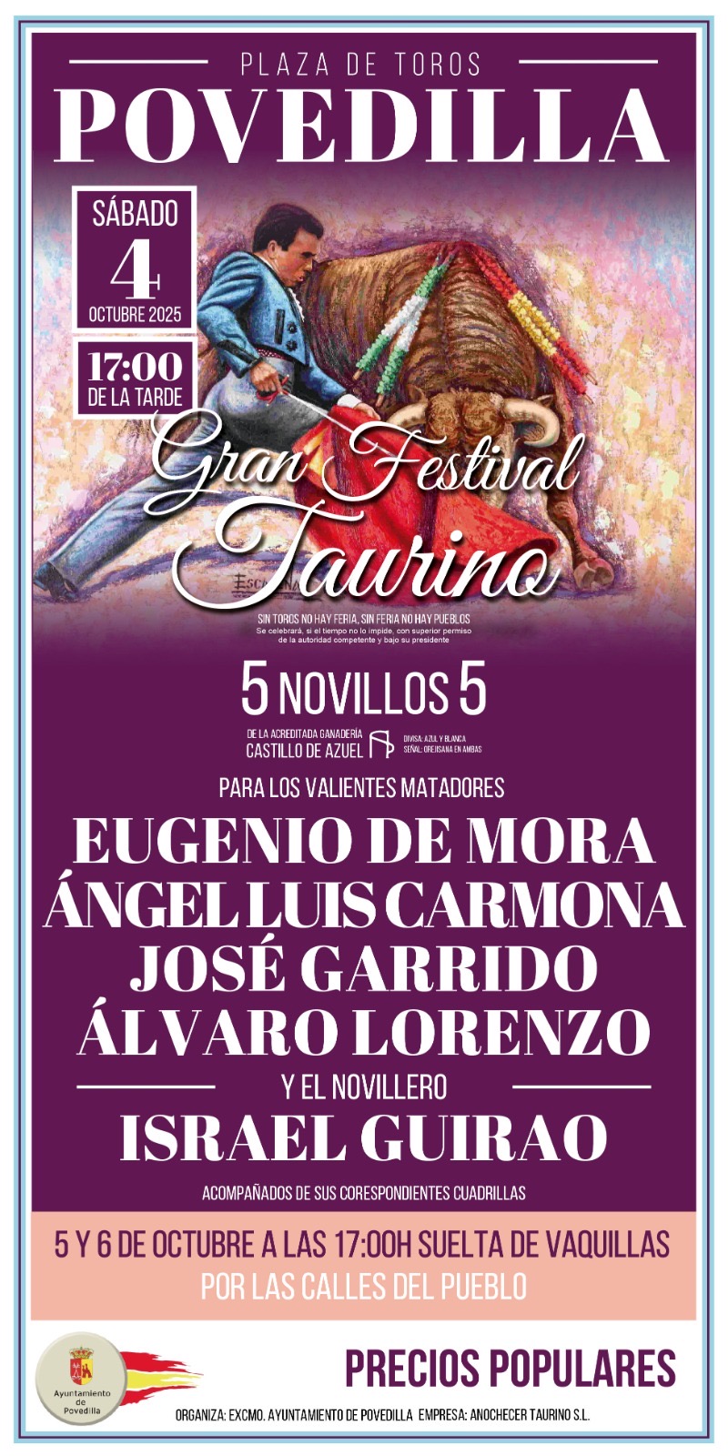 En el mismo se van a lidiar astados de Castillo de Azuel y alternará con los matadores de toros  Eugenio de Mora, Ángel Luis Carmona, Jose Garrido y Álvaro Lorenzo.
