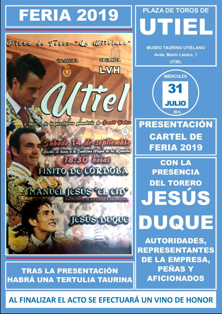 El próximo miércoles día 31 de julio a las 8:00 de la tardetendrá lugar la presentación de la corrida de toros que se celebrará en Utiel con motivo de las fiestas de la Virgen del Remedio.