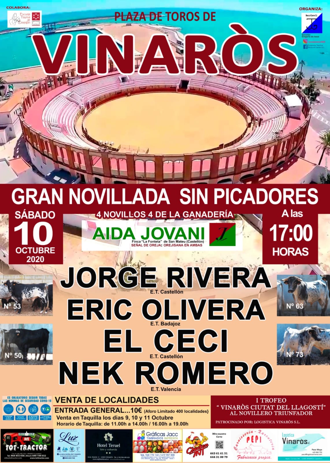 El festejo comenzará a las cinco de la tarde y en el estará en liza el I Trofeo Vinaròs Ciutat del Llagostí al triunfador patrocinado por Logística Vinarós SL.