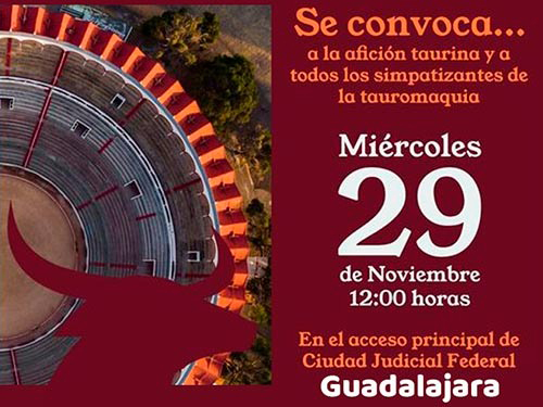 El grupo Movimiento Cultural Taurino de Guadalajara ha convocado a los profesionales y aficionados taurinos, así como al público en general, a la manifestación pacífica que se realizará hoy miércoles 29 de noviembre en esta ciudad mejicana.