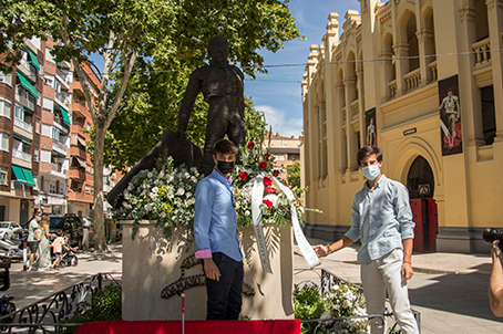 El alumno de la E.T. de Albacete Rubén Cortés y el matador de toros Pedro Marín depositaron un ramo de flores ante la estatua que representa a Chicuelo II mientras que el novillero con caballos Alejandro Peñaranda y el alumno de la E.T. de Albacete Nicolás Cortijo hicieron lo propio ante la escultura de Dámaso.