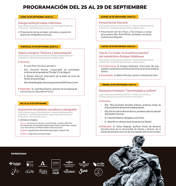 La asociación Mujer y Tauromaquia inaugura el lunes día 25 de septiembre sus I Jornadas Culturales, un ciclo de cuatro conferencias que se desarrollarán a lo largo de la semana en el Centro Cultural José Luis García Palacios de la Fundación Caja Rural del Sur de Sevilla, en la calle Murillo, 2. En ellas intervendrán importantes personalidades de la universidad, la cultura y el mundo del toro.