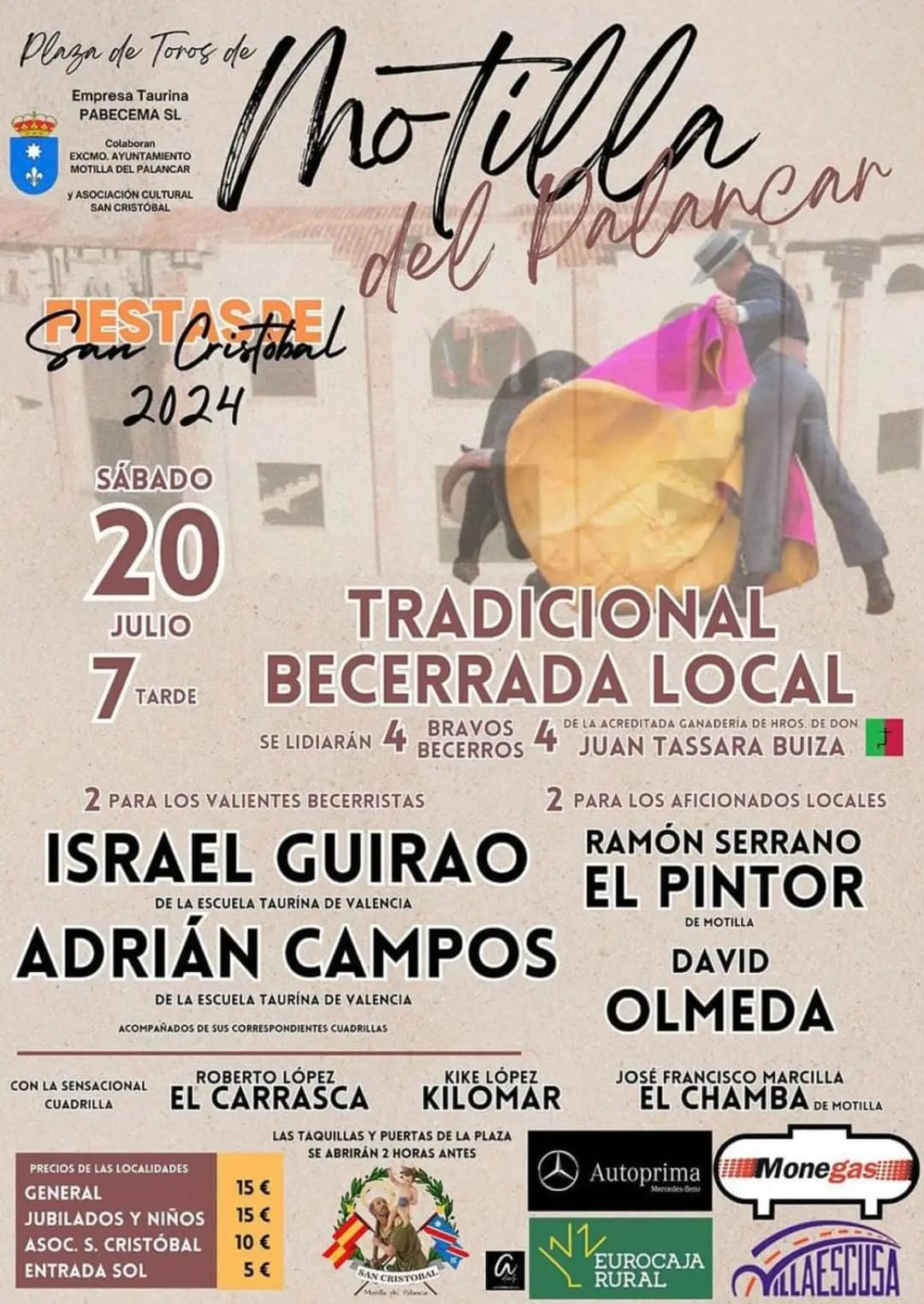 Los alumnos de la escuela de tauromaquia de Valencia Israel Guirao y Adrián Campos van a tomar parte en un festejo anunciado para el día 20 de julio en la localidad conquense de Motilla del Palancar. Un espectáculo  organizado por la empresa Pabecem SL con motivo de las fiestas de San Cristóbal con la colaboración del ayuntamiento y asociación cultural San Cristóbal.