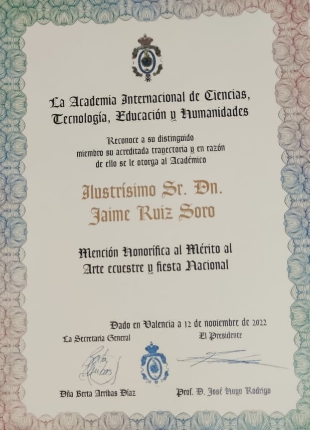 El picador de toros valenciano Jaime Ruiz Soro ha sido distinguido por la Academia Internacional de Ciencias, Tecnología, Educación y Humanides que preside José Royo Rodríguez con el título de Académico de honor en reconocimiento de sus méritos.