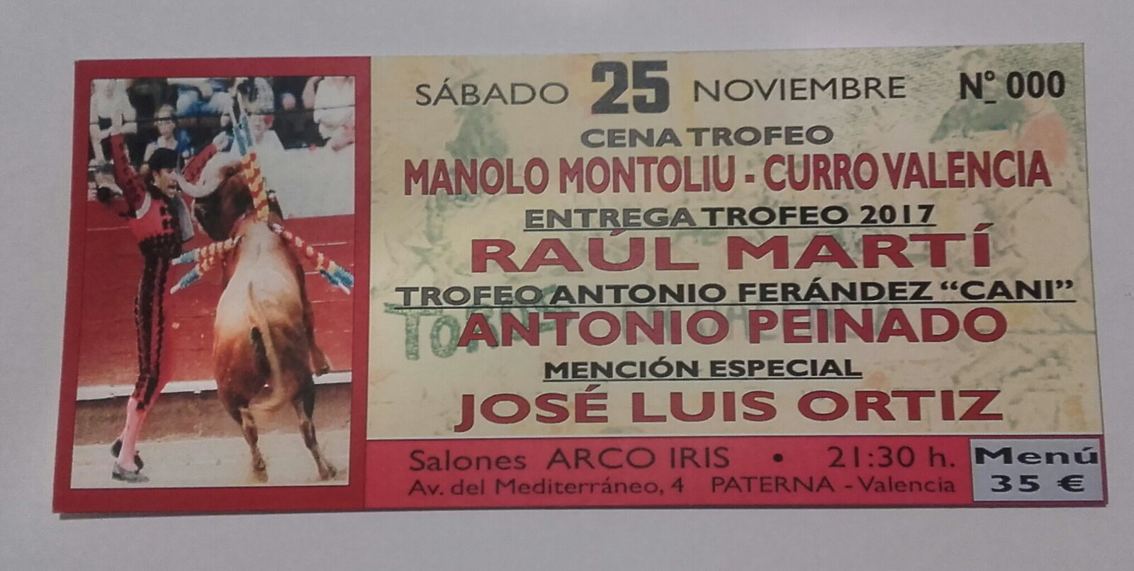 El premio al subalterno más sobresaliente en Valencia ir a parar a manos de Raúl Martí, quien milita en la cuadrilla del matador de toros Román Collado. Asimismo, habrá un trofeo, que lleva el nombre de Antonio Fernández Tejada, para el también banderillero valenciano Antonio Peinado, quien esta temporada ha decidido retirarse de los ruedos para seguir dedicándose a desempeñar labores empresariales y de apoderamiento. Este año ha organizado los festejos taurinos en Utiel y ha llevado la carrera del matador valenciano Alberto Gómez.