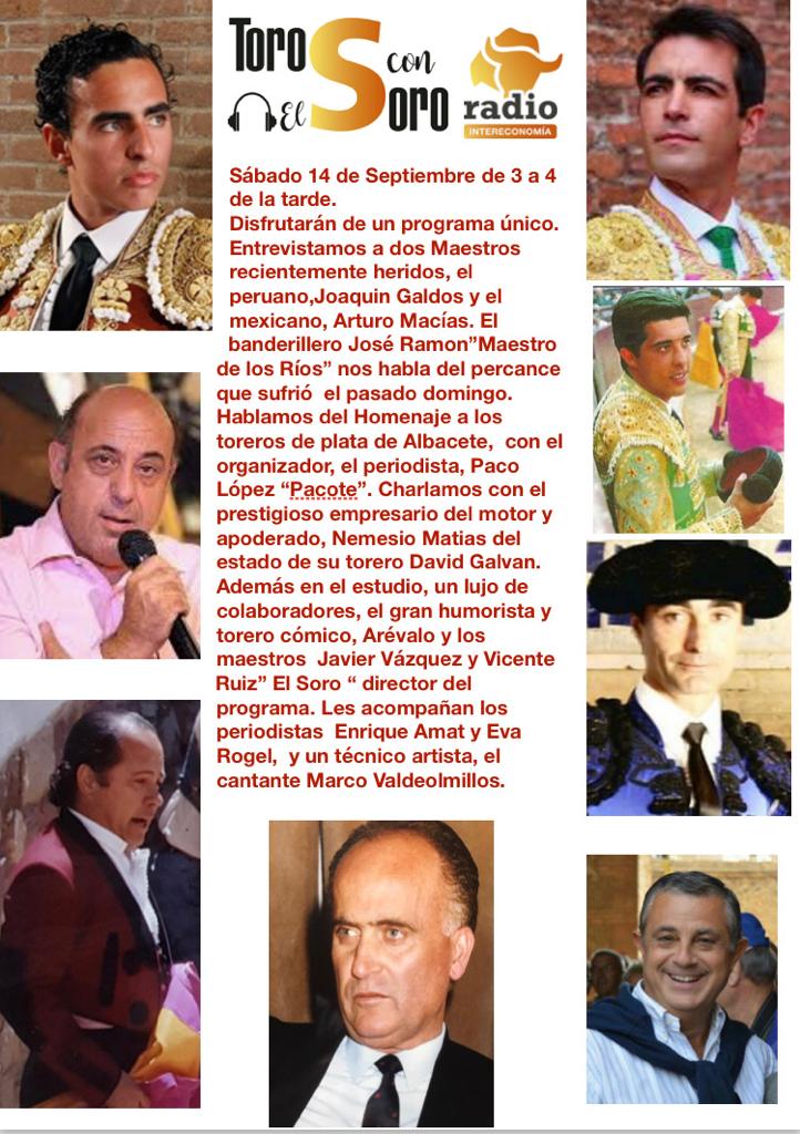 El programa TOROS CON EL SORO de Radio Intereconomía, que dirige Vicente Ruiz el Soro junto con Eva Rogel, se puede  escuchar la tarde de hoy sábado a partir de las 15.00 horas.