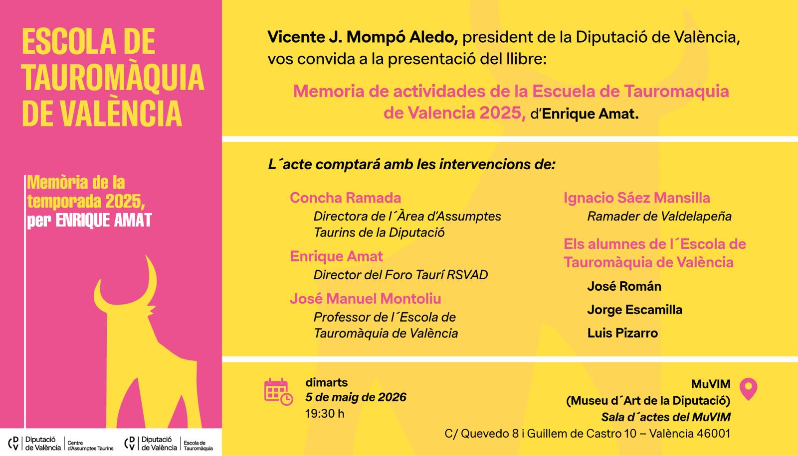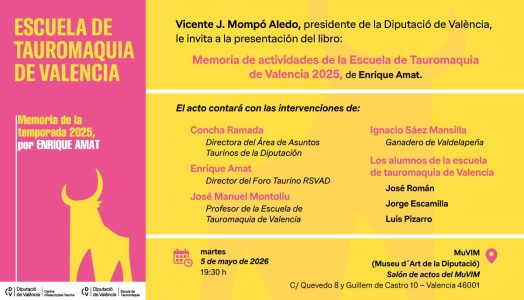 El MuVIM (Museu d’Art de la Diputació) será marco, el próximo 5 de mayo, a las 19.30, horas, de la presentación de la “Memoria de la temporada 2025 de la Escuela de Tauromaquia de Valencia “.