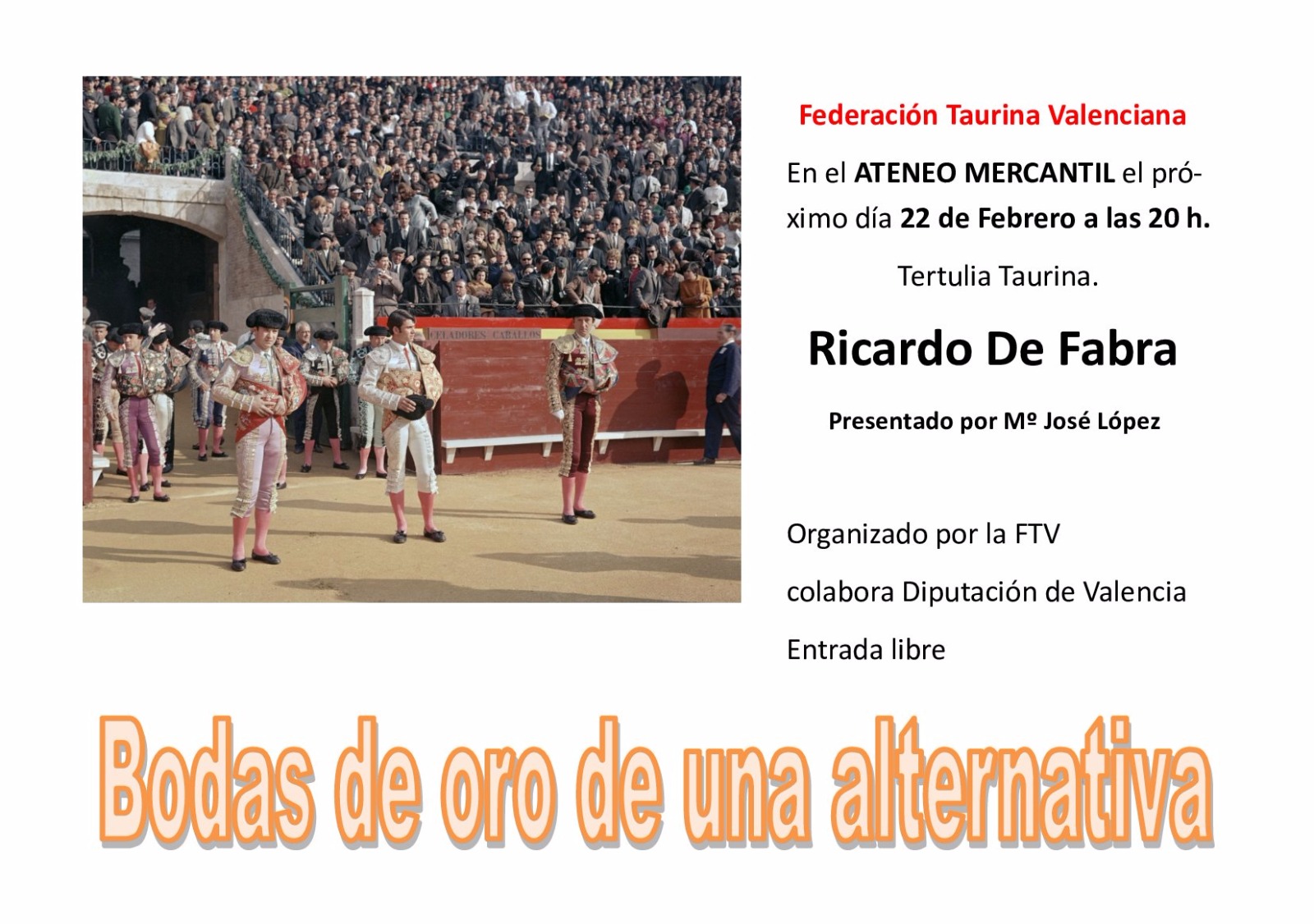 La Federación Taurina Valenciana, que preside Jose Miguel Soria, ha organizado para el próximo jueves, día 22 de febrero, un acto homenaje, con motivo del 50 años de la alternativa del matador de toros valenciano Ricardo de Fabra.
