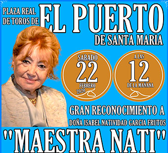 El Espacio Cultural Taurino y flamenco de Sal y Oro, rendirá un reconocimiento a la trayectoria de Doña Isabel Natividad García de Frutos “Maestra Nati”, en un acto que se desarrollara el próximo sábado 22 de Febrero a las 12 del mediodía en la Plaza Real de toros de El Puerto de Santa María, tras el acto se inaugurara una exposición sobre la Maestra Nati en la sala de exposición de la Plaza Real que estará abierta de 22 al 29 de Febrero.