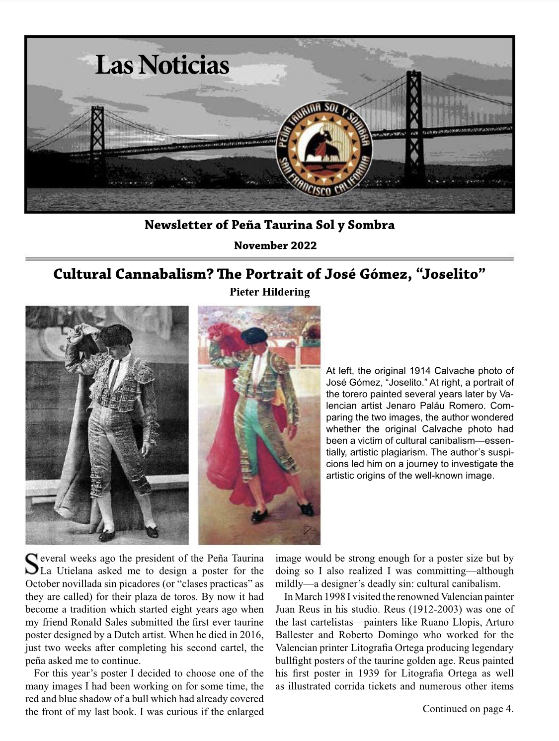Acaba de publicarse el número correspondiente al mes de noviembre de 2022 de la revista de la Peña Taurina Sol y Sombra, de la localidad estadounidense de San Francisco en el estado de California.