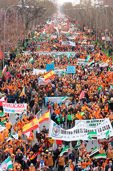 Más de 800.000 personas, 1600 autobuses provenientes de distintos puntos del país, especialmente de aquellas zonas en las que actividades ligadas al medio rural como la agricultura, la ganadería o la caza son una fuente principal de subsistencia y desarrollo, y, por supuesto, ciudadanos de Madrid se han dado cita en la capital de España para mostrar su apoyo al mundo rural y contra las políticas que están asfixiando al campo y las actividades y costumbres ligadas a él.