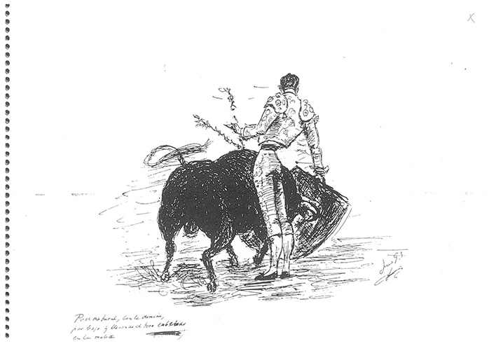 Algunas de las ilustraciones corresponden a toreros que fueron figuras, como Manolete y Antonio Ordóñez, y más contemporáneos: Dámaso González y Enrique Ponce. En la portada del cuadernillo figura la cabeza de un toro veleto (hecho a carboncillo). Los dibujos, realizados en plumillas, corresponden a los años 1993-94.