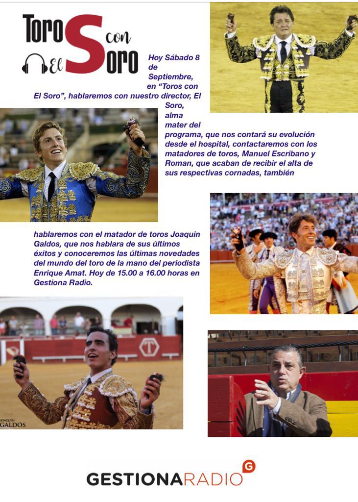 Asimismo pasarán por los micrófonos de Gestiona Radio los matadores de toros Roman y Manuel Escribano, quienes hablarán de la evolución de las heridas sufridas en las plazas de Bayona y Belmonte respectivamente.
