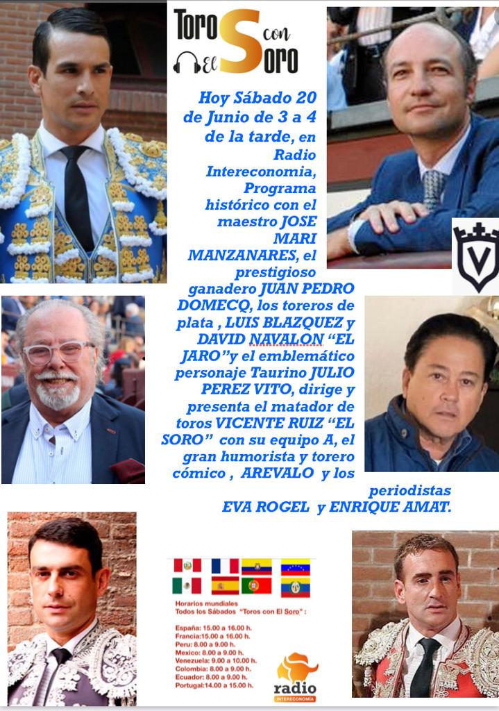 El programa “Toros con el Soro”, que se emite en Radio Intereconomía hoy sábado 20 de junio de 15:00 a 16:00 horas, y que dirige Vicente Ruiz “El Soro” junto con Eva Rogel, cuenta de nuevo con un importante elenco de invitados.
