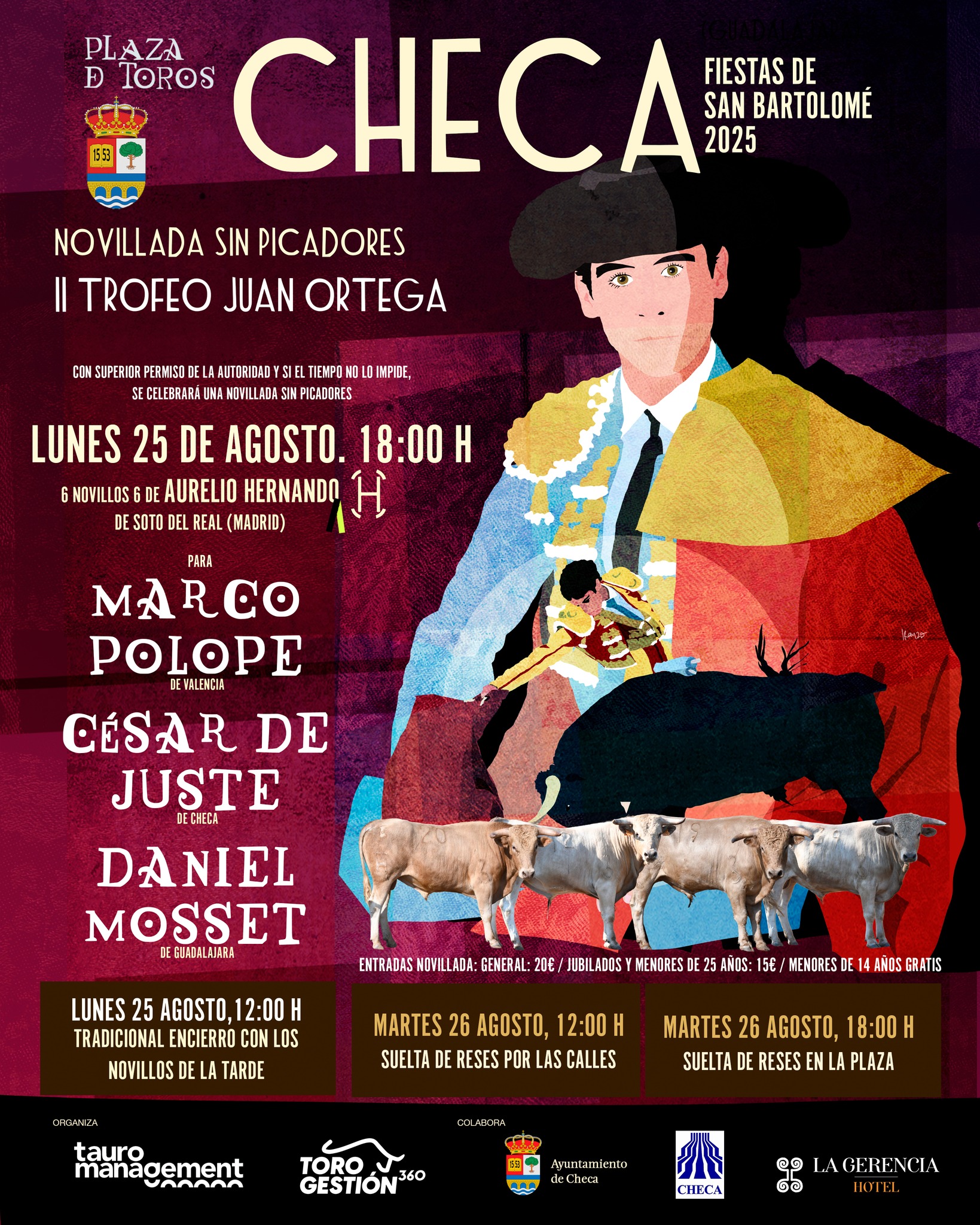 Será en una novillada sin picadores que este año lucirá El Hierro de Aurelio Hernando, para un cartel compuesto por los novilleros Marco Polope, César de Juste, originario de Checa y Daniel Mosset, de la escuela taurina de Guadalajara.