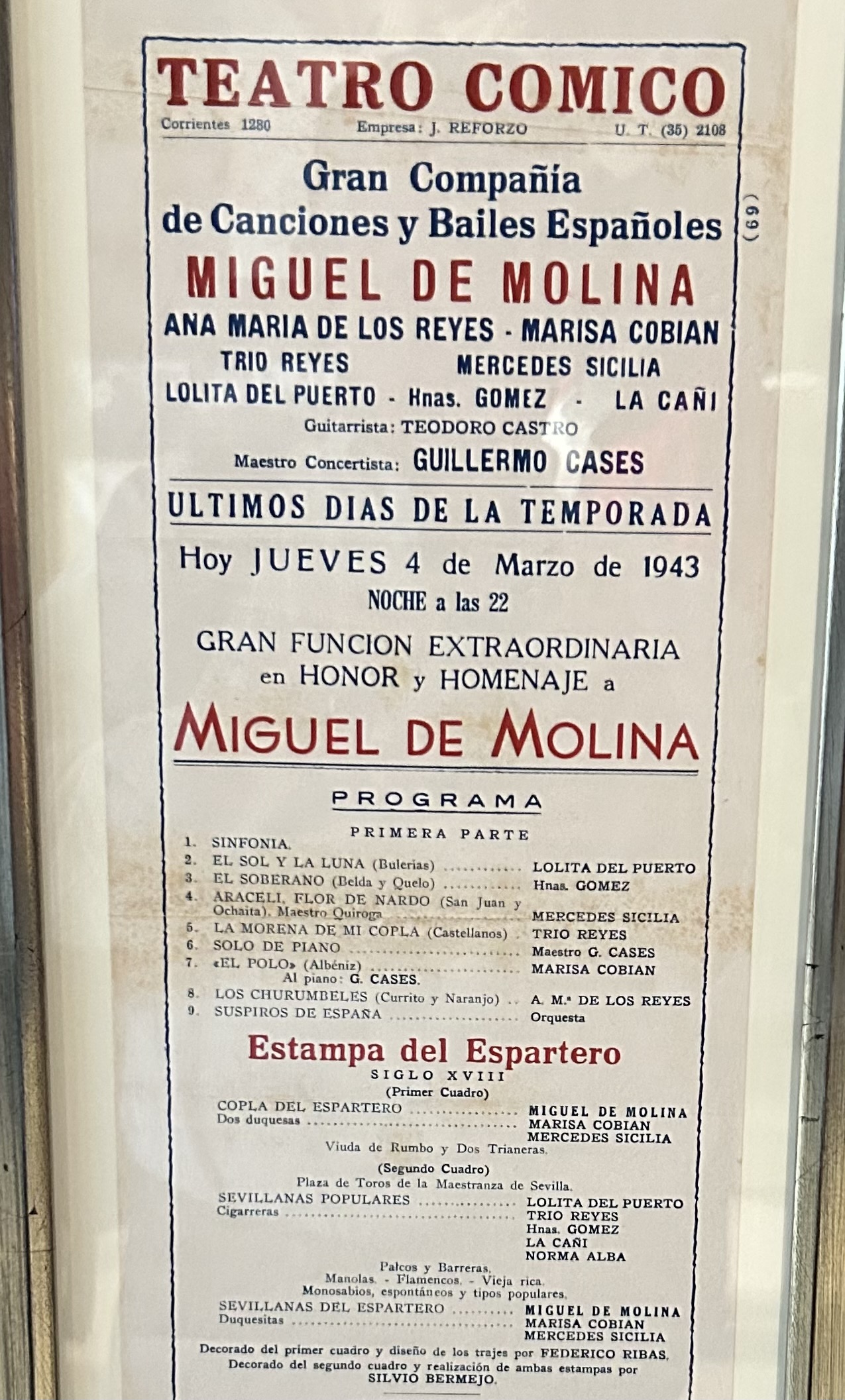 Dentro de la misma, hay un hueco para la tauromaquia. Se cuelga una foto de Manuel Rodríguez Manolete con una dedicatoria a este artista. Y también el cartel de una representación de la obra titulada “Estampas del Espartero”. Extraordinaria versión de esta canción del género de la sevillana: Sevillanas del Espartero, en la voz de este gran artista quien nace para el mundo artístico en 1931. Formó pareja con Soledad Miralles, “bailaora” que había abandonado los escenarios tras su boda con Bernardo Ruiz Carnicerito de Málaga, y a los que volvió tras separarse de éste. Formaron pareja de cante y baile y debutaron en el Teatro Romea. En sus comienzos compartió pareja y cartel con otras artistas como Adelita Durán, Pilar Calvo o Amalia de Isaura. Con el tiempo llegó a ser una primera figura de la copla y rivalizó, en la época de oro de este género, con los dos nombres de mayor peso y enjundia que ha dado la canción española, Conchita Piquer y Juanita Reina