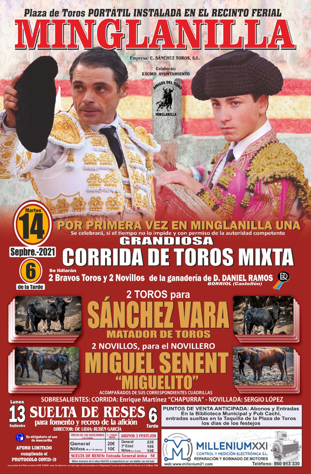 La plaza de toros conquense de Minglanilla acogerá el próximo 14 de septiembre una corrida de toros mixta organizada por la empresa de C. Sánchez Toros SL en colaboración con el Ayuntamiento de la ciudad y la Peña Amigos del Toro de Minglanilla.