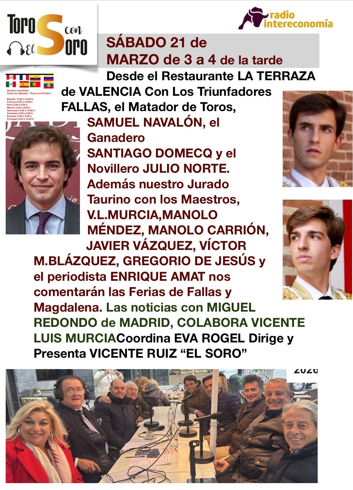 Esté sábado 21 de marzo de 3 a 4 de la tarde PROGRAMA RADIOFÓNICO Toros con El Soro en RADIO INTERECONOMÍA. Desde el Restaurante LA TERRAZA de VALENCIA con los triunfadores de FALLAS, el matador de toros, SAMUEL NAVALÓN, el ganadero SANTIAGO DOMECQ y el novillero JULIO NORTE. Además el Jurado Taurino con los maestros, Vicente Luis Murcia, MANOLO MÉNDEZ, MANOLO CARRIÓN, JAVIER VÁZQUEZ, VÍCTOR M.BLÁZQUEZ, GREGORIO DE JESÚS y el periodista ENRIQUE AMAT nos comentarán las Ferias de Fallas y Magdalena. Las noticias con MIGUEL REDONDO de MADRID. Coordina EVA ROGEL Dirige y presenta VICENTE RUIZ "EL SORO".