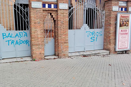 La Plaza de Toros Monumental de Barcelona amaneció ayer con pintadas anónimas en contra de Balañá y su decisión de no dar toros.