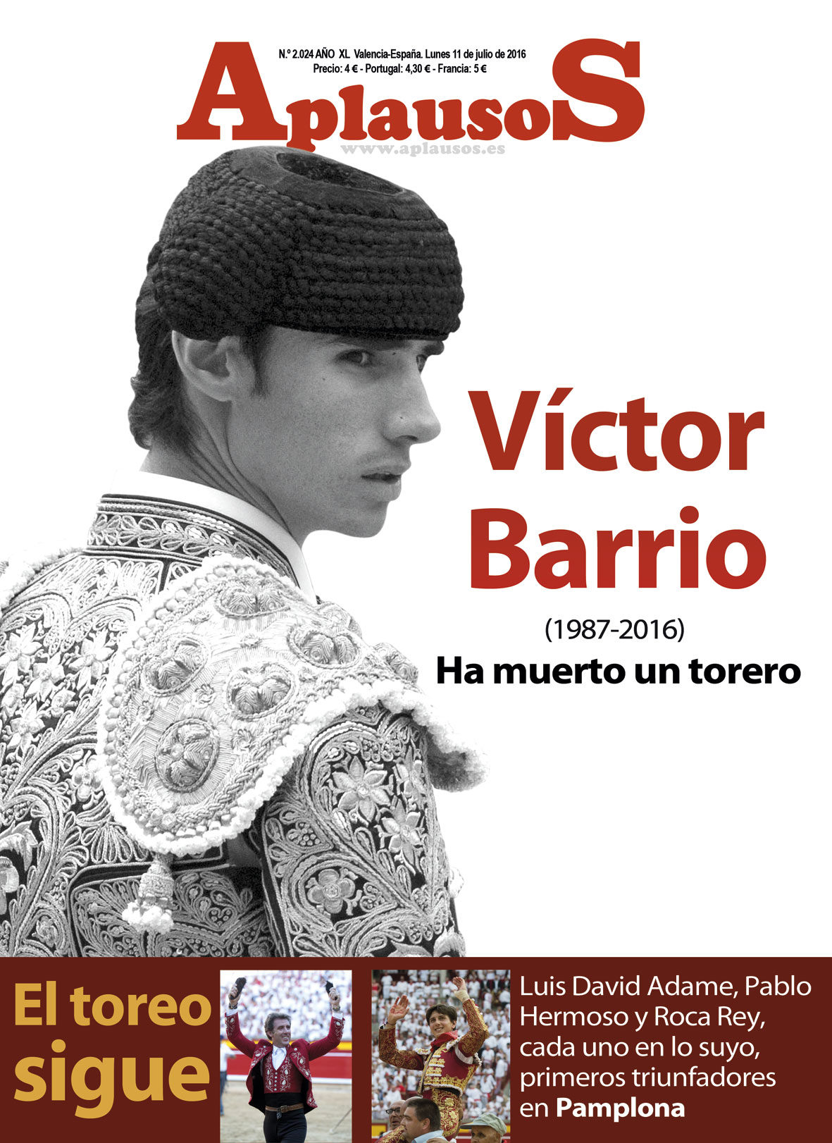 APLAUSOS dedica la portada de su número 2.024 a Víctor Barrio. Bajo el título “Ha muerto un torero”, el semanario taurino recuerda la figura del torero segoviano y narra el fatal percance así como el último adiós que le tributaron amigos, vecinos y toreros en la capilla ardiente instalada el domingo en Sepúlveda. La actualidad de los festejos pasa por la Feria del Toro de Pamplona que en su primera mitad dejó como triunfadores a Luis David Adame, Pablo Hermoso de Mendoza y Roca Rey.