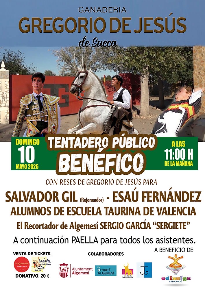 El domingo 10 de mayo, en la ganadería de Gregorio de Jesús de Sueca, tendrá lugar un tentadero benéfico. En el mismo se lidiarán reses del propio Gregorio de Jesus y tomarán parte en el mismo el matador de toros Esaú Fernandez, el rejoneador Salvador Gil y los alumnos de la escuela de tauromaquia de Valencia. Completará al espectáculo el recortador de Algemesí, Sergio García Sergiete. Comenzará a las once de la mañana y cuando finalice habrá paella para todos los asistentes. Es a beneficio de la asociación Adisalge, con un precio de 20 € como donativo.