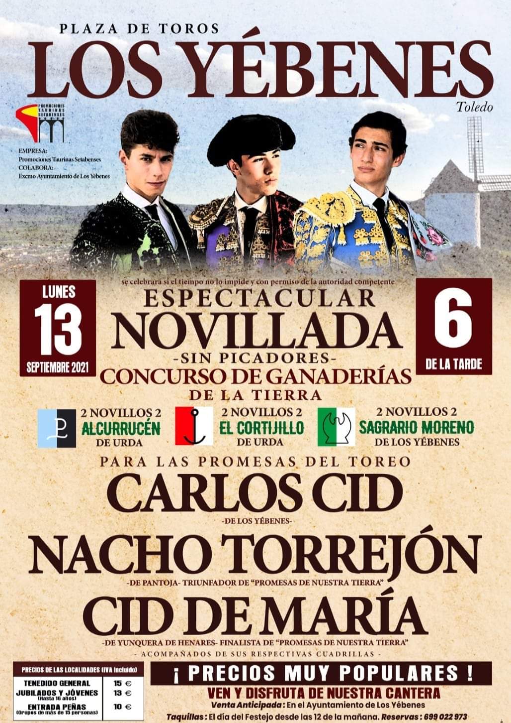 Los novilleros del cartel son el local CARLOS CID de los Yebenes que reaparecerá para la ocasión ante sus paisanos, NACHO TORREJÓN el novillero que tiene a toda la provincia de Toledo alborotada después de su triunfo en el certamen “Promesas de nuestra tierra “, y CID DE MARIA quien también llegó a la final de dicho certamen.