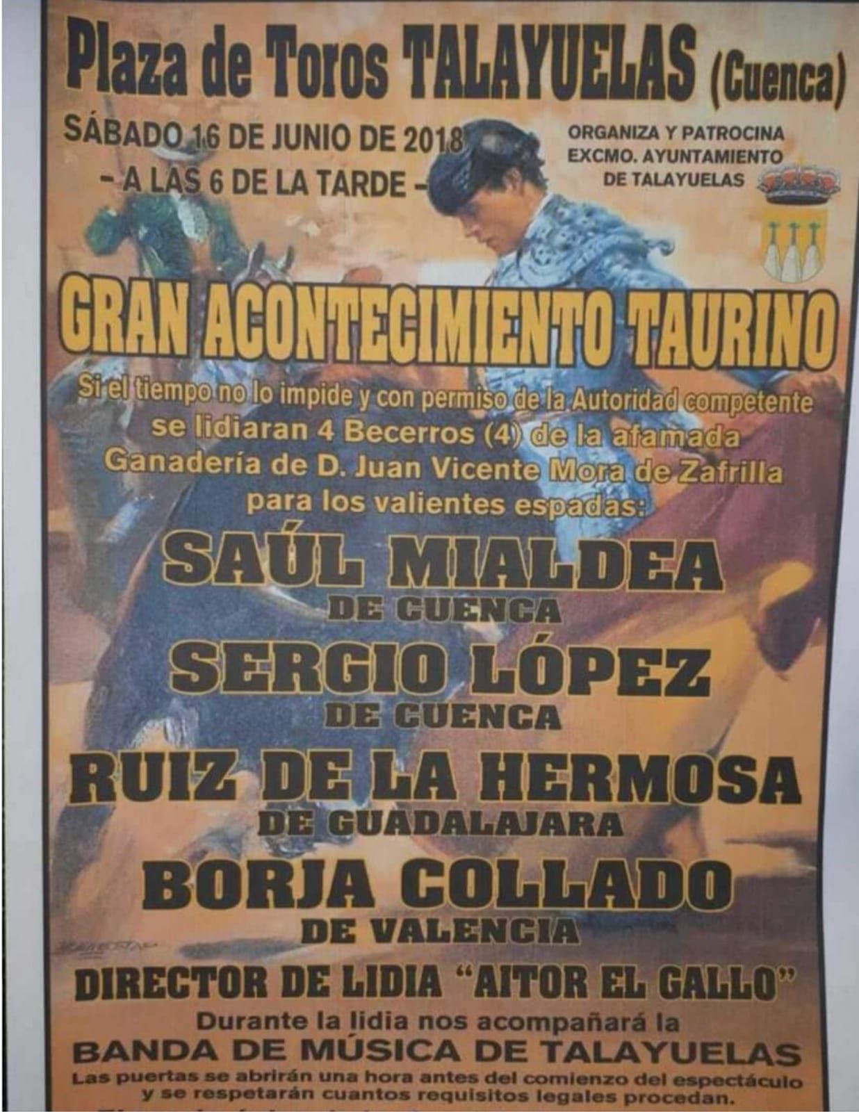 La localidad conquense de Talayuelas, que cuenta con una singular plaza de toros, va a ser marco de una novillada con participación de alumnos de escuelas de tauromaquia. En la misma se van a lidiar astados del ganadero turolense afincado en Valencia Juan Vicente Mora, con divisa verde y rosa y señal horquilla en la oreja derecha y rajada en la izquierda, con procedencia Santa Coloma. Entre los actuantes figura el valenciano Borja Collado, a quien acompañarán Sergio López y Saúl Mialdea, ambos de Cuenca, y el alcarreño Ruiz de la Hermosa. El está programado para el sábado 16 de junio a las seis de la tarde
