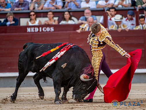 Borja Jiménez recibió a su bravo, con transmisión y encastado primero mandando por verónicas. Esperó en banderillas. Brindó al público. Vibrante fue el inicio con la muleta llevándolo por abajo semigenuflexo en redondo, rodilla en tierra y de rodillas con el respetable jaleándolo. Con la derecha en el tercio bajó el engaño frente a un embroque exigente, sometiendo y con entrega. Con la izquierda poniéndose en el sitio se cruzó, los dio de frente con verdad, ligados, adelantando la pierna de salida y dejándolo detrás. Junto a la raya exterior finalizó por derechazos y trincheras derrochando torería. A su segundo le costó pasar en el capote. En la muleta soltó la cara con peligro, rebrincó y fue irregular. Aguantó el molesto cabeceo y derrote por el derecho consiguiendo ligar a base de mucho exponer. Por el izquierdo se paró dos veces en la cara poniéndole los pitones cerca del pecho y Borja sin moverse. Faena solvente frente a un áspero y complicado toro.