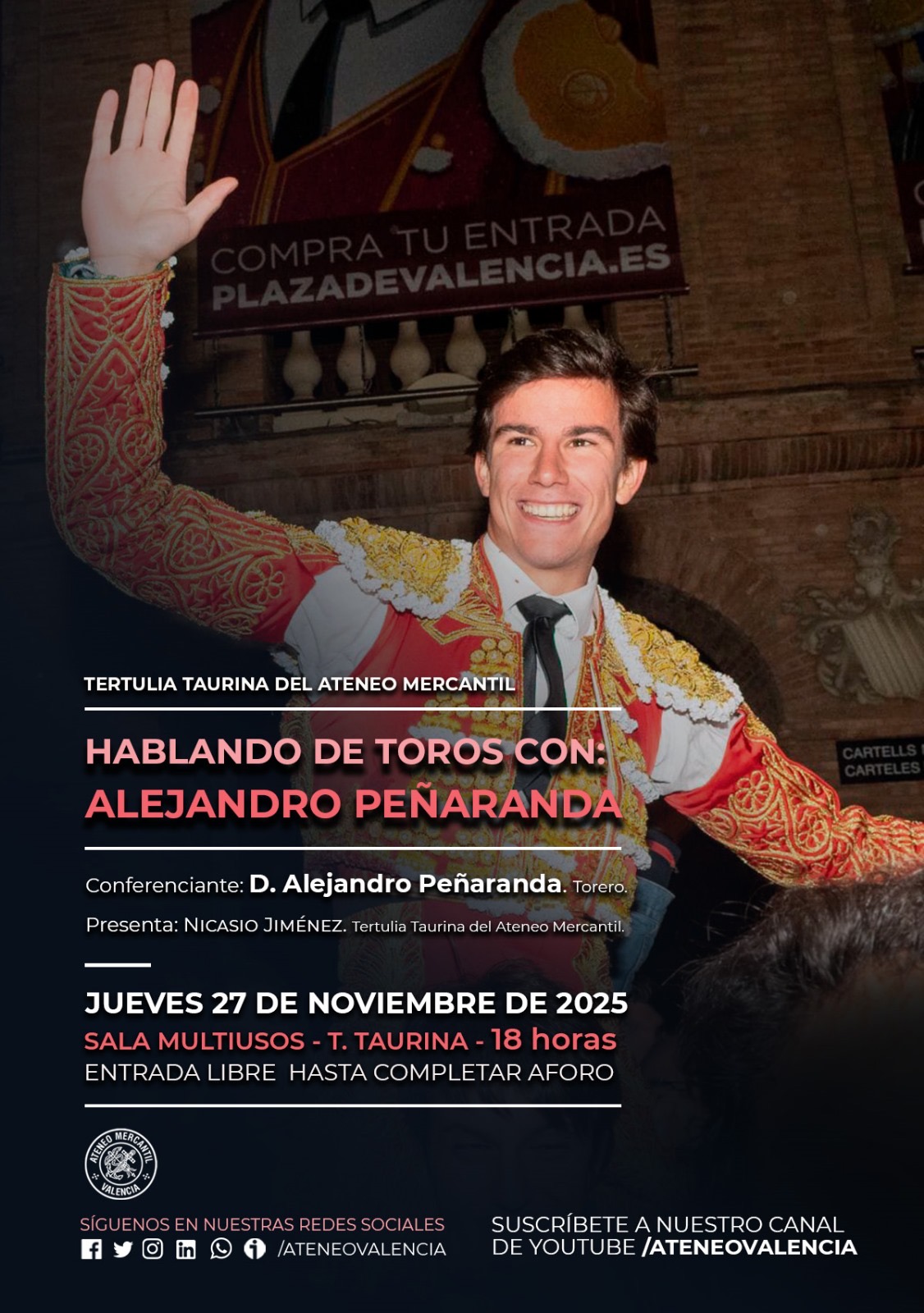 En esta ocasión, se cuenta con la presencia del matador de toros Alejandro Peñaranda. Conducirá el encuentro Nicasio Jiménez, miembro de la Tertulia Taurina del Ateneo y se celebrará en la Sala Multiusos del Ateneo Mercantil (7ª planta).