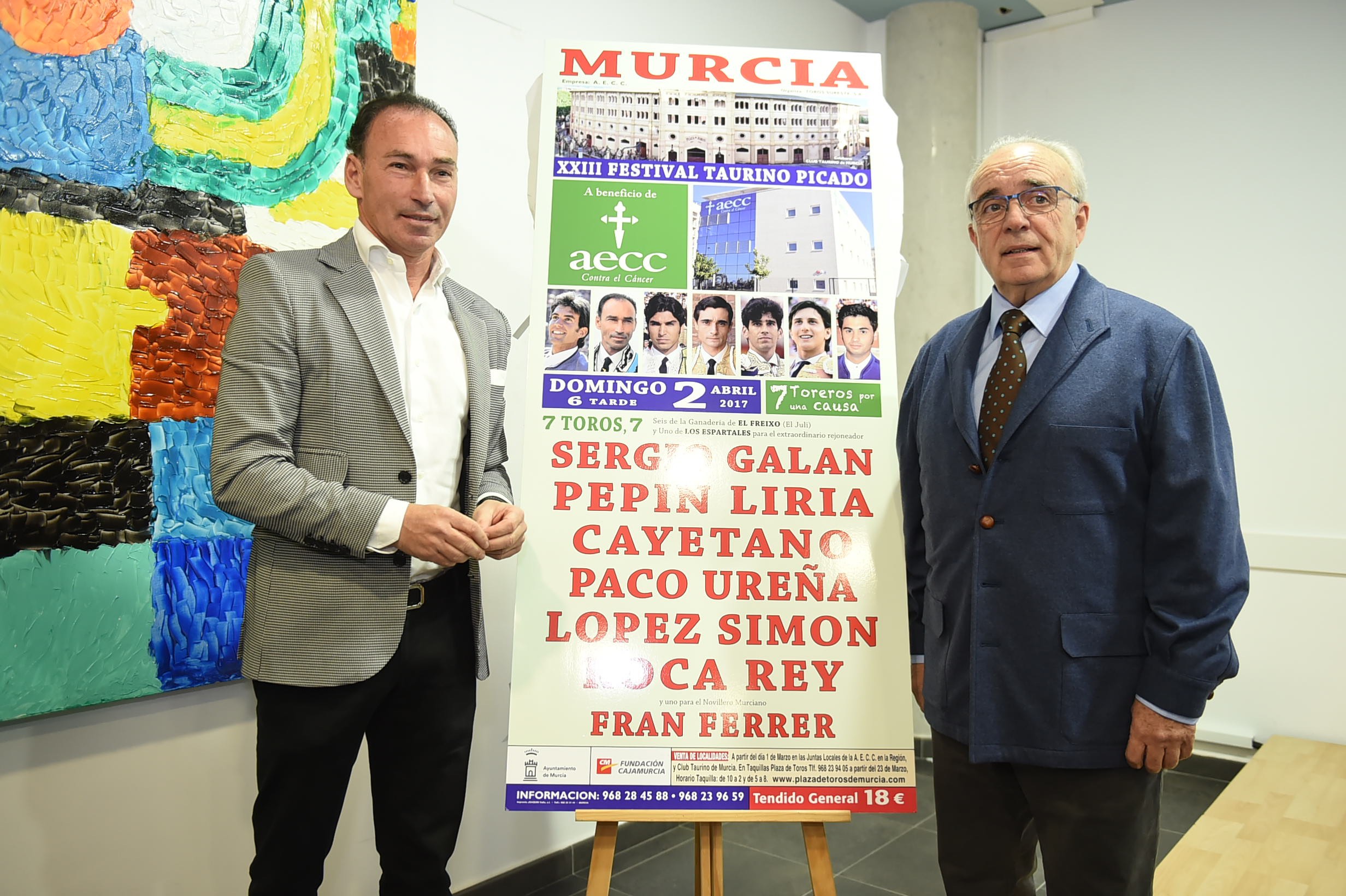 La presentación se desarrolló en la sede de la Asociación Española Contra el Cáncer en Murcia y contó con la presencia del presidente de la Aecc Región de Murcia, Agustín Navarrete Montoya, el empresario de la plaza de Murcia y alma máter de este festejo, Ángel Bernal. El Gobierno regional estuvo representado por la consejera de Presidencia, María Dolores Pagán Arce. También asistieron el director general de Salud Pública, Manuel Molina Boix, el director general de Administración Local, Diego Pardo Domínguez, y la concejal delegada de Derechos Sociales, Concepción Ruiz Caballero. Tampoco se quisieron perder esta presentación el matador de toros Pepín Liria y el novillero Fran Ferrer, ambos incluidos en el cartel.