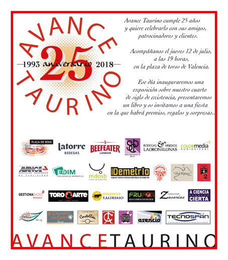 Este mes de julio se cumple el XXV Aniversario de la revista Avance Taurino, icono de las publicaciones que se reparten en las plazas de la Comunitat Valenciana, así como en alguna fuera de ella. Contaremos con su director, Paco Delgado, e insignes colaboradoeres del medio desde su creación, como son los periodistas Ricardo Díaz Manresa y Paco Picó.
