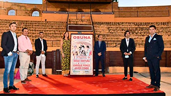 En un acto celebrado ayer, la Alcaldesa de Osuna, Rosario Andújar, acompañada por el empresario local, Antonio Osuna y el secretario general de Interior y Espectáculos Públicos de la Junta de Andalucia, Miguel Briones, presentó el cartel de la corrida que se celebrará el día 1 de agosto en esta ciudad sevillana.