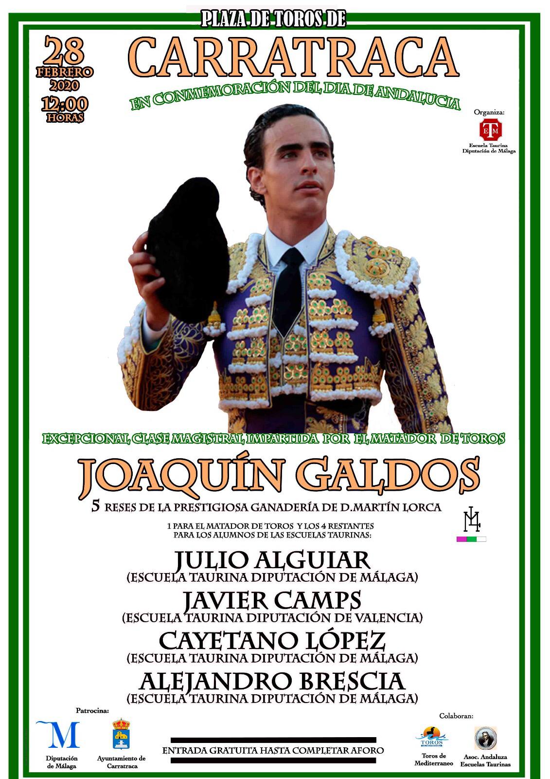 Ese día se celebrará, a las doce de la mañana, una clase práctica protagonizada por el matador de toros Joaquín Galdós. Y junto a Camps también tomarán parte en el festejo los alumnos de la escuela de tauromaquia de Málaga Cayetano López, Julio Alguiar y Alejandro Brescia. Los astados a lidiar pertenecen al hierro de Martín Lorca.