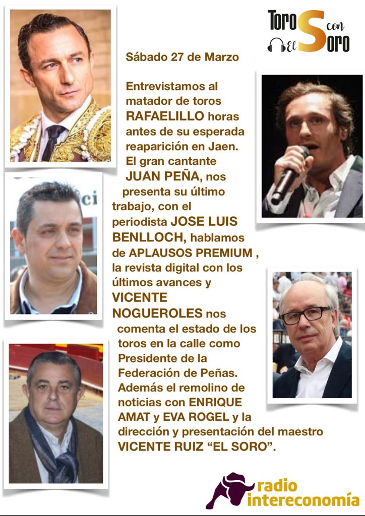 El programa “Toros con el Soro”, que se emite en Radio Intereconomía mañana sábado 27 de marzo de 2021 de 15:00 a 16:00 horas, y que dirige Vicente Ruiz El Soro junto con Eva Rogel, va a contar con un notable y variado elenco de invitados.
