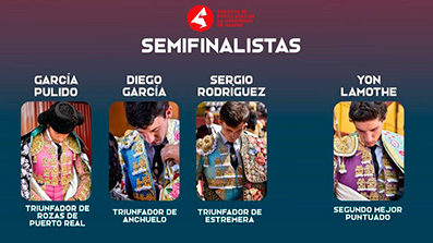 Terminadas las dos fases clasificatorias del Circuito de Novilladas de Madrid 2022 estos son los cuatro nombres que se volverán a ver las caras en las semifinales: García Pulido, Diego García, Sergio Rodríguez y Yon Lamothe.