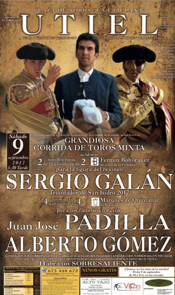 El próximo sábado, 9 de septiembre, a las cinco y media de la tarde tendrá lugar la corrida de toros programada con motivo de la feria de la Virgen del Remedio de Utiel. En el centenario coso de la Utielana la AG TOROS SL, con Antonio Peinado al frente, ha compuesto un terna que está integrada por el rejoneador Sergio Galán, quien lidiará dos toros del hierro de Fermín Bohórquez. Y a pie desfilarán por el albero utielano Juan José Padilla, quien hace su debut como matador de toros en esta plaza tras triunfar el pasado sábado en Requena, y el valenciano Alberto Gómez, quien cumplió con creces ante la corrida de Cuadri la pasada feria de julio de Valencia. Éstos dos últimos lidiarán reses de la ganadería segoviana del Marqués de Quintanar. Con divisa roja y amarilla, estos toros pastan en la finca “Vega De Tabanera” de Segovia. La ganadería procede de vacas de Carmen Giménez García y un semental de Cebada Gago, y fue posteriormente ampliada con la compra de reses de Los Derramaderos. Como sobresaliente está anunciado Enrique Martínez Chapurra.