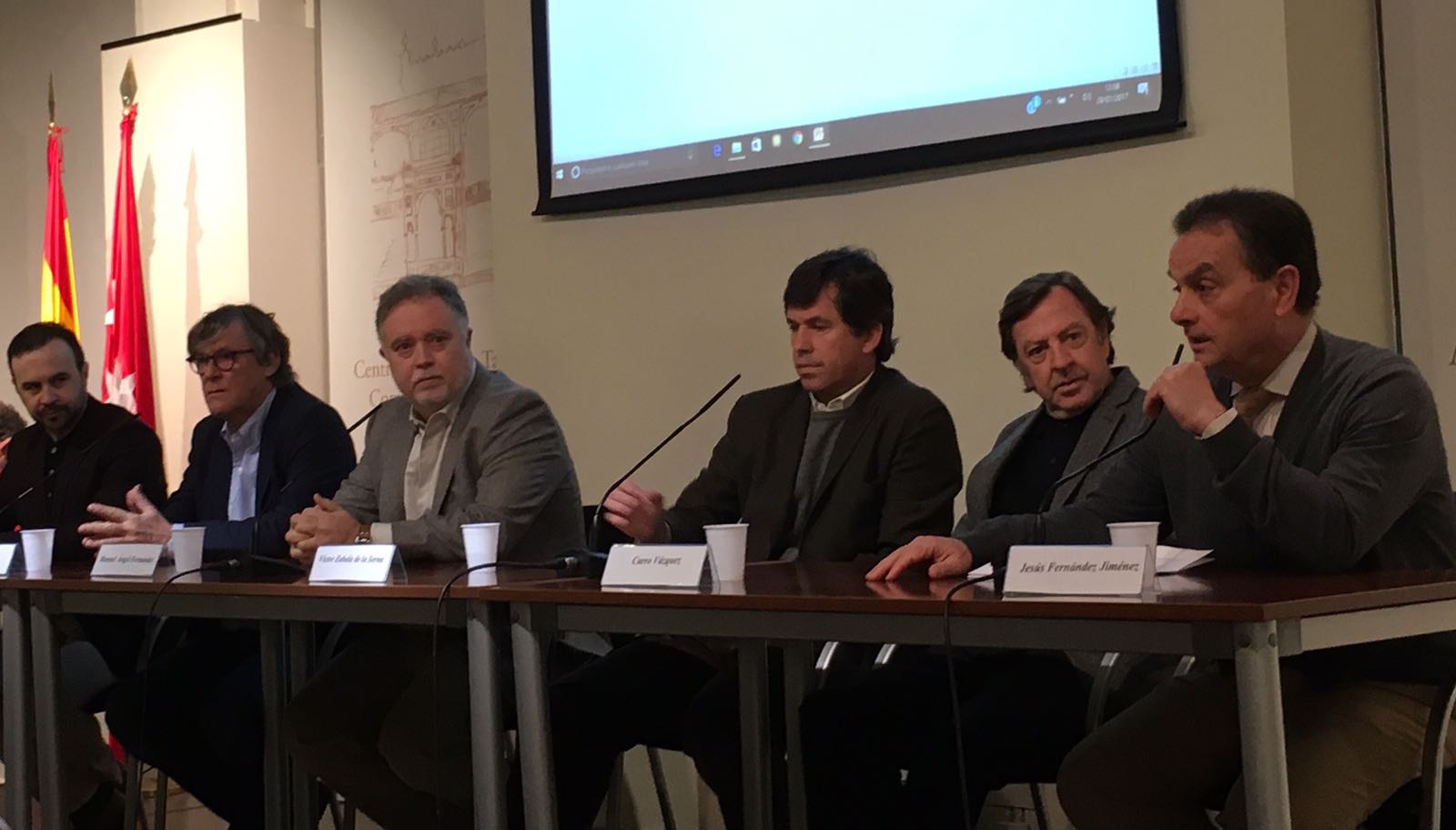 Simón Casas, co-empresario de Plaza 1, Curro Vázquez, Director de la Escuela Taurina; Joserra Lozano, Director de Comunicación; y Víctor Zabala, gerente adjunto de Plaza 1, fueron invitados a la última mesa del Ciclo de Conferencias de la Unión, y estuvieron acompañados por Manuel Ángel Fernández, Director del Centro de Asuntos Taurinos de la Comunidad de Madrid. La Sala Antonio Bienvenida, donde transcurrió el acto, registró un lleno completo, movido por la expectación que genera la nueva empresa gestora de Las Ventas. El Presidente de la UAATM, Jesús Fernández, fue el encargado de dirigir el acto. En el mismo, Simón Casas desveló dos novedades considerables en la programación de la temporada: la creación de la Corrida de la Cultura, con la que se pretende reforzar el concepto de la tauromaquia como Cultura; y la inclusión de Gómez del Pilar en el cartel de Victorino Martín, en la que será su confirmación.