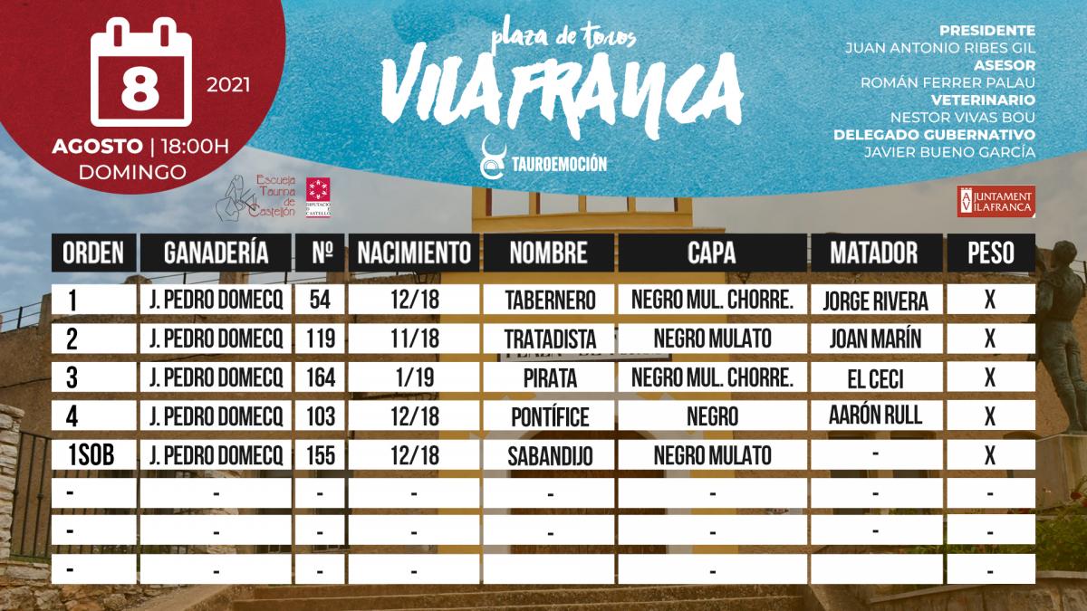 Organizada por la empresa Tauroemoción, estaba prevista la  lidia de reses de Juan Pedro Domecq para los castellonenses Jorge Rivera. El Ceci y Aarón Rull y completaba el cuarteto el también oriundo de la provincia aunque alumno de la Escuela de Tauromaquia de Valencia Joan Marín.