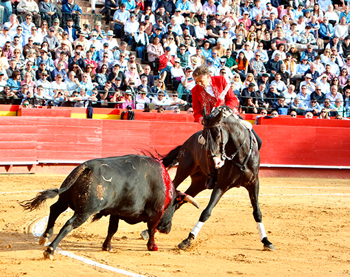Ahorró castigo al cuarto en el primer tercio, luciendo luego al recorrer el ruedo con el toro pegado a la cola de su caballo Berlín y al banderillerar con Malbec. Gollerías.