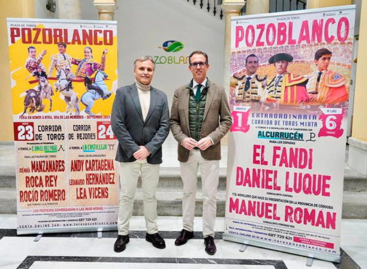 El alcalde de Pozoblanco, Santiago Cabello, y el empresario Antonio Tejero, propietario de la empresa adjudicataria de la Plaza de Toros de la localidad, Caído y Soledad SL, han presentado esta mañana los carteles de la temporada taurina 2023 en esta ciudad cordobesa. Una campaña compuesta de tres festejos, el primero de ellos el sábado 1 de abril y las otras dos tardes, una de toreo a pie y otra de rejones, en la Feria de Nuestra Señora de las Mercedes del mes de septiembre.