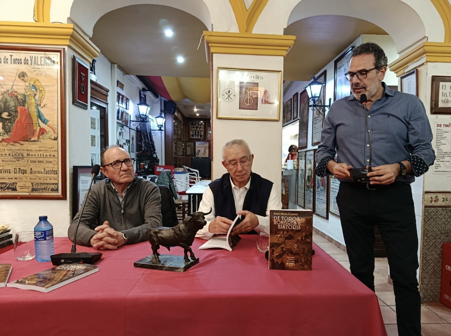 Este martes, día 11 de marzo de 2025, tras la clase práctica que tuvo lugar en la plaza de toros, Tinto y Oro ha sido escenario de la presentación del libro “De toros, hombres e historia” de Jesús Moya Casado. El acto estuvo presentado por Enrique Galduf, vicepresidente de la FTV y El presidente de Tinto y Manuel Monzo
