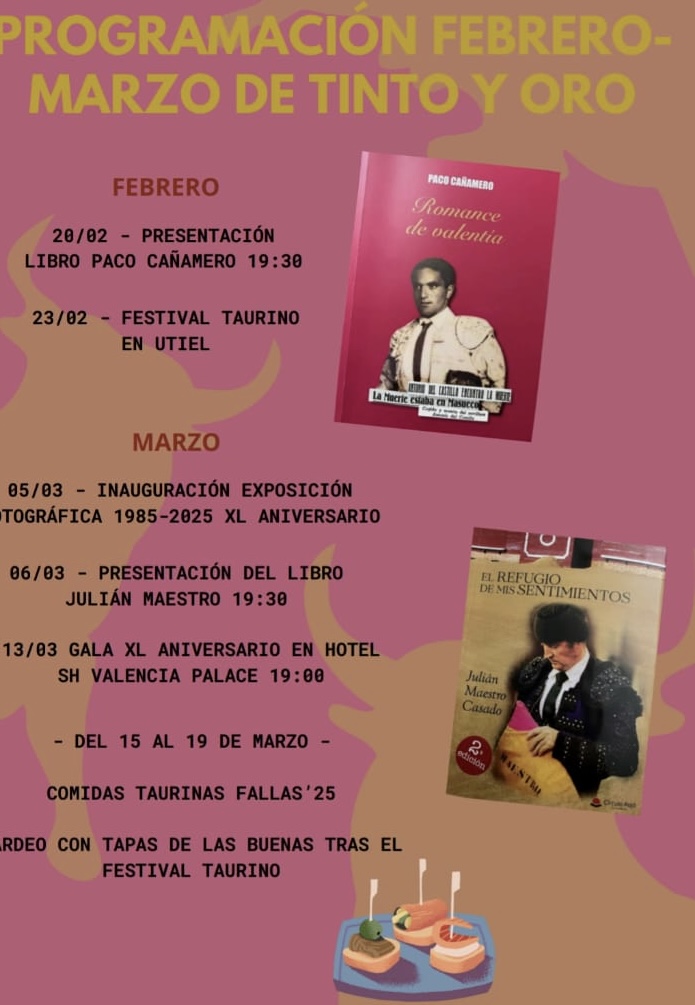 El dia 13 en el SH Valencia Palace se celebrará una gala conmemorativa del aniversario de Tinto y Oro, y de los días 15 al 19 habrá comidas taurinas en la peña y después del festejo de la tarde, el habitual tardeo.