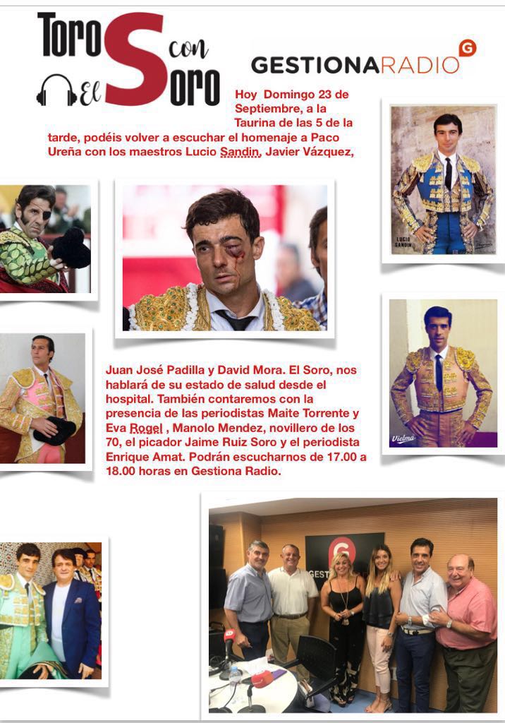 El programa TOROS CON EL SORO de Gestiona Radio, que dirige Vicente Ruíz el Soro junto a Eva Rogel y que se vuelve a emitir esta tarde de domingo a partir de las 17.00 horas, tiene como lema “Toreros de la superación”. Para comenzar, se conectó con el Hospital Clínico de Valencia, desde donde el director del programa habló de la positiva evolución de su estado de salud.