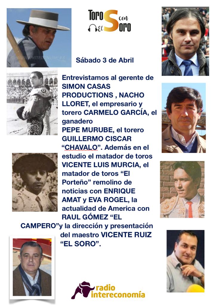 El programa “Toros con el Soro”, que se emite en Radio Intereconomía el sábado 3 de abril de 2021 de 15:00 a 16:00 horas, y que dirige Vicente Ruiz El Soro junto con Eva Rogel, va a contar con un notable y variado elenco de invitados.