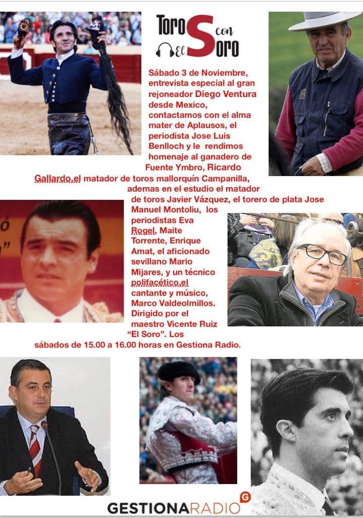El programa TOROS CON EL SORO de Gestiona Radio, que dirige Vicente Ruiz el Soro junto con Eva Rogel y que se emite mañana sábado a partir de las 15.00 horas, tiene un amplio y variado contenido. Con el director del programa a los mandos en el estudio, en la emisión van a estar presentes, entre otros, el rejoneador Diego Ventura, quien actúa el próximo día 11 en la Monumental de México, para hablar de lo que será su temporada por plazas mexicanas.
