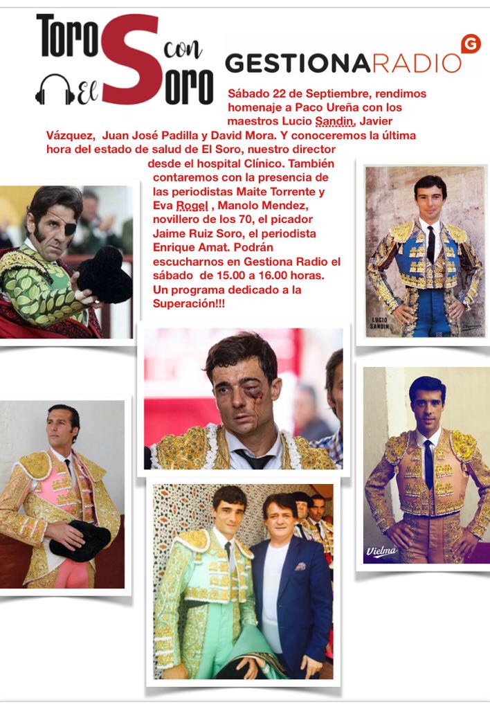 Asimismo, pasarán por los micrófonos de Gestiona Radio, tres coletudos que sufrieron un percance muy parecido al de Ureña, como son Juan José Padilla, Lucio Sandin y Javier Vázquez.